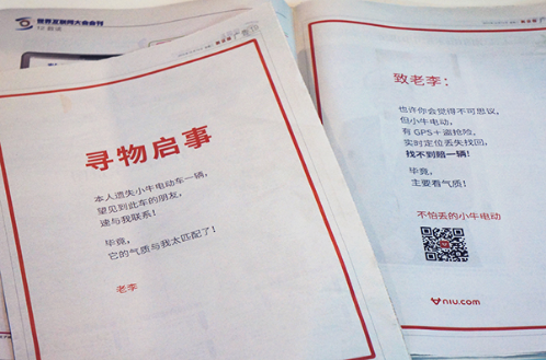 效果虽然很难量化,但可以试想一下,在全世界电视台都在报道的一个地方,在《新京报》投放到乌镇的世界互联网大会会刊上,小牛电动车用一前一后两版大广告,来告诉大家“不怕丢,敢丢就敢赔”,再通过社交媒体平台同步进行话题传播……效果可见一斑。
