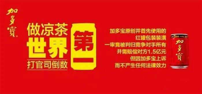 2014 年 12 月,一审判决败诉的加多宝在微博发出一张自我调侃的海报作为回应,称自己是 " 两个第一 " —— " 做凉茶世界第一,打官司倒数第一 "。