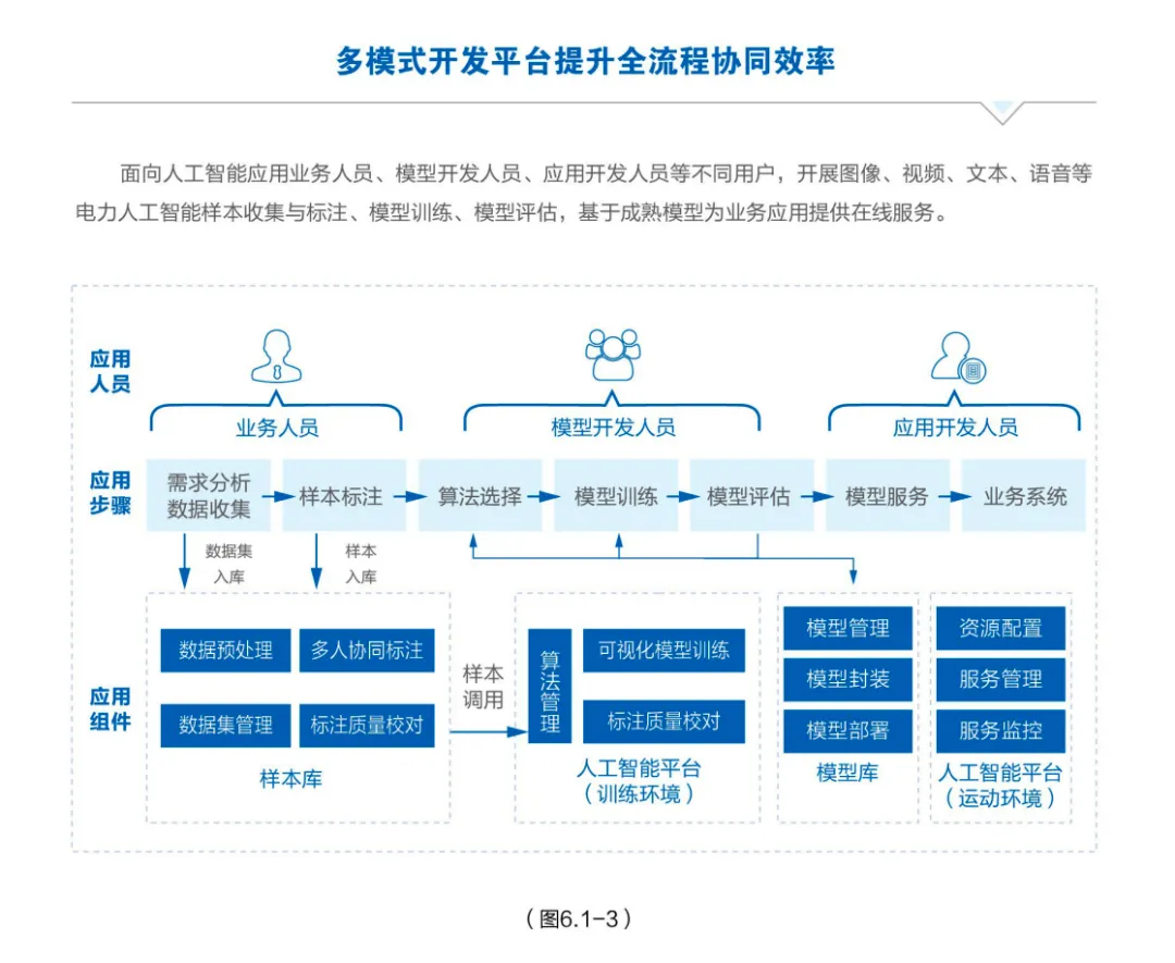 在开发端,国网实现了全流程协同的开发模式,使得模型开发人员、应用开发人员、业务应用人员通过百度开发生态提供的开发工具以及各种接口服务具备了电力智能化的服务能力。