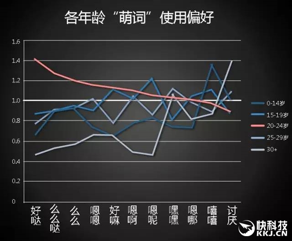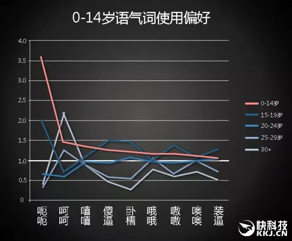 0-14岁的小网民最喜欢酷词,其中“呃呃”的使用达到了平均水平的3.6倍。