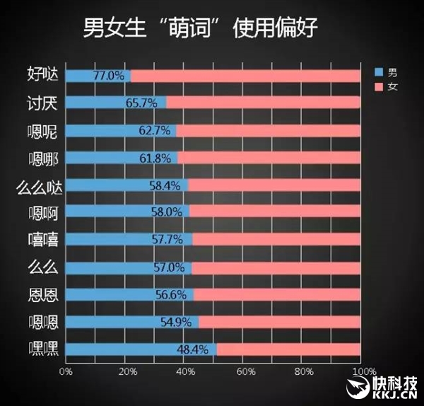 “粗词”对应的就是“萌词”了,相反,妹子是主力,但男生也爱卖萌。妹子最爱的是“好哒”,男生则是“嘿嘿”。让人意外的是,“么么哒”在男生中的使用比例也达到了42.6%,