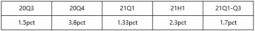 费率方面,随着海尔智家数字化战略转型不断深入,三季报显示,其销售费用率同比下降了1.1pct,管理费用率同比下降了0.6pct,整体费用率同比再优化1.7pct。在此之前,海尔智家20Q3、20Q4、21 Q1、21H1费率持续优化。同时前三季度毛利率达到了30.2%,同比上升了2.2个百分点。