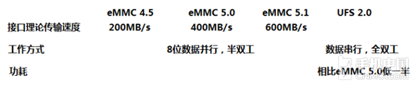 另一方面,UFS 2.0支持全双工运行,可同时进行读写操作,读取和写入操作都有专门的通道,还支持指令队列。相比之下,eMMC是半双工,读写必须分开执行,读取和写入 操作共用同一条通道,指令也是打包的,在速度上就已经略逊一筹了。打个比方,单车道和双车道的区别不用多解释也知道哪条车道的行车更加顺畅,关键是,那条 单车道还是分时复用车道,这段时间全部车辆只能自西向东行驶,下一段时间全部车辆只能自东向西行驶,工作效率不如两条独立车道,分别引导两个不同方向的车 流。而且UFS 2.0芯片不仅传输速度快,功耗也要比eMMC 5.0低一半,可以说是日后旗舰手机闪存的理想搭配。