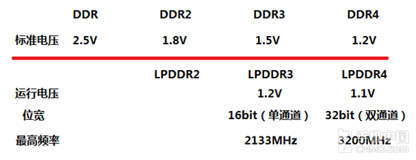 如上图所示,LPDDR的运行电压(工作电压)相比DDR的标准电压要低,这也符合了低功耗小体积的身份和定位,另一方面,两种标准版本迭代时间并不是一致的,DDR4相比LPDDR4标准制定和出台要早上不少。