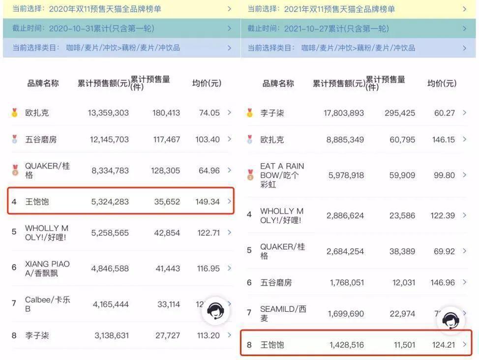 自去年双十一开始,来自魔镜市场情报的数据显示,王饱饱在 2021 年双十一第一轮预售中销售额为 142.9 万元,而 2020 年同期这个数据是 532.4 万元,下滑近 70%。
