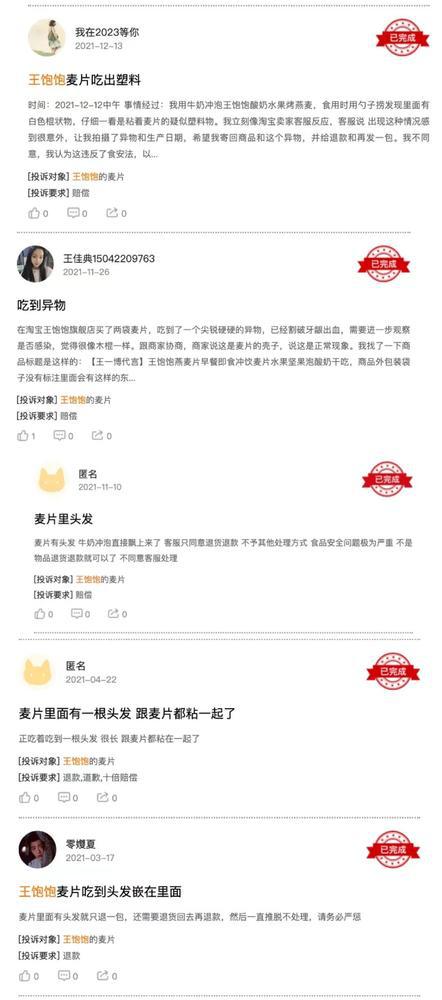 另外,打开黑猫平台,王饱饱被投诉产品里面吃出塑料、吃出异物、吃出头发,因食品安全的投诉占总投诉量的 53%,关于王饱饱的食品安全问题也是被消费者吐槽的重点。