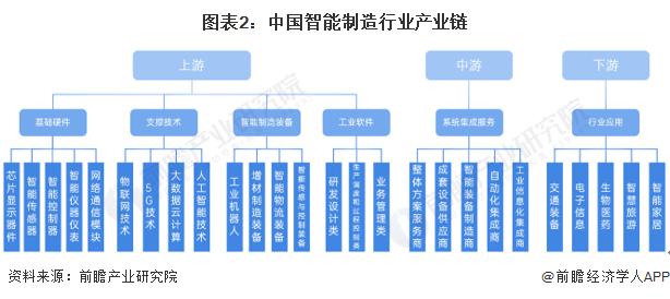 从产业的产业链上下游来分析,中国智能制造行业的产业链上游行业主要为基础硬件、感知层次的相关硬件产品、智能制造装备和工业软件 ; 而中游行业则是智能制造装备供应商和智能制造解决方案提供商等系统集成服务提供商 ; 下游领域主要为市场需求方,包括了交通装备、电子信息、生物医药等行业。