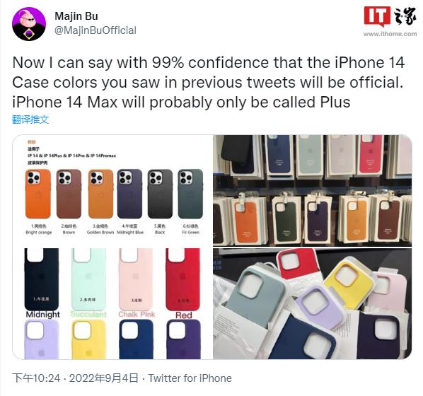 现在爆料人士展示了新款 iPhone 14 系列的皮革和硅胶外壳的颜色,另外更大的常规 iPhone 14 Max 版本实际上可能被称为 iPhone 14 Plus 。
