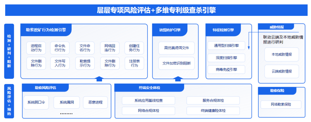 针对当前头号威胁——勒索病毒,提出检测、预防、防御、响应、溯源、加固全闭环的一体化解决方案,创新提出了勒索诱饵防护及文件保险柜等防护能力,精准阻断未知勒索病毒,做到数据“可用不可改”;