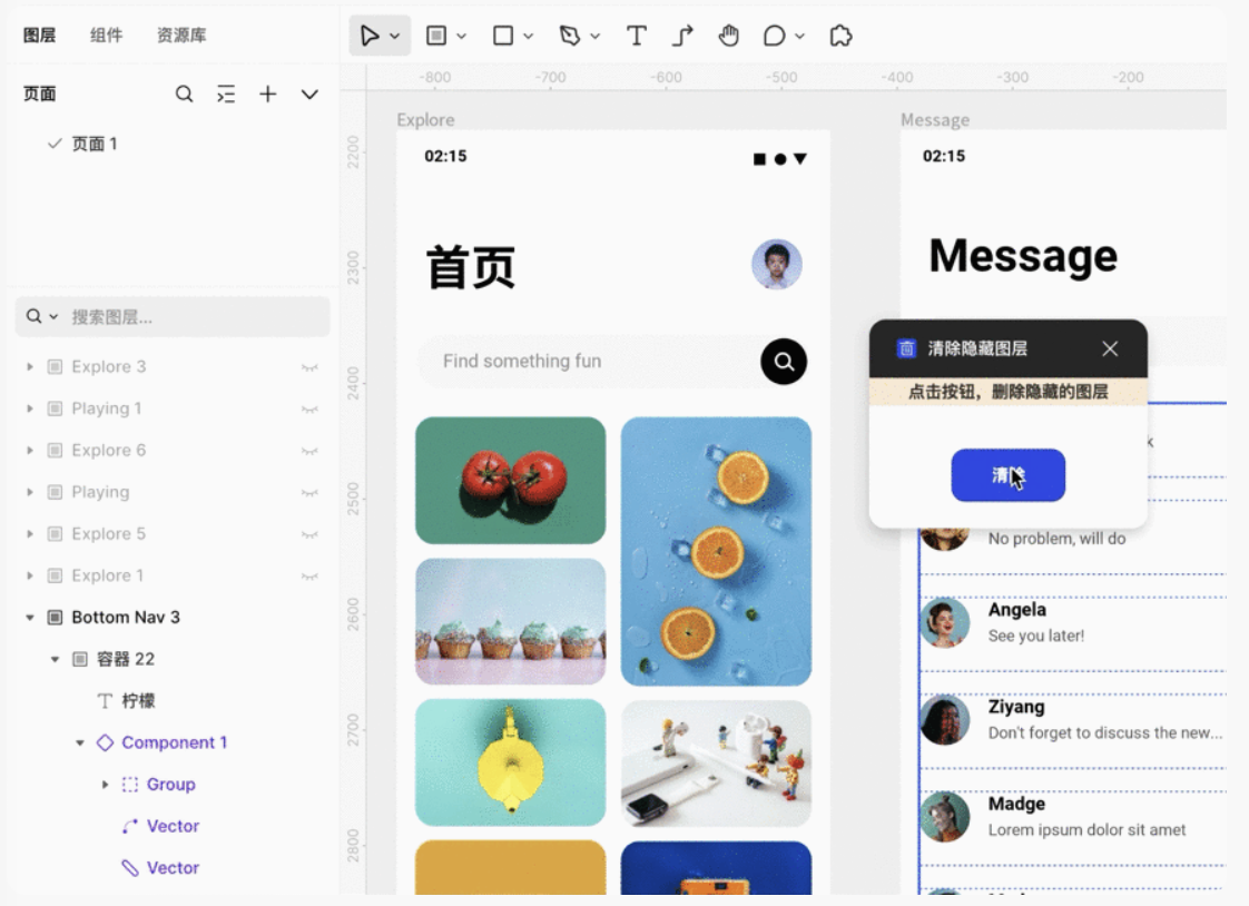 标记了很多隐藏图层,现在不想要了,一个个删除太麻烦?怎么办?你可以使用这个一键清除所有隐藏图层的插件!首先,在「插件广场」找到并安装「清除隐藏图层」插件,然后在设计模式下,点击工具栏中的「插件」-「清除隐藏图层」即可看到清除隐藏图层弹窗,点击「清除」按钮,一键删除全部隐藏图层。