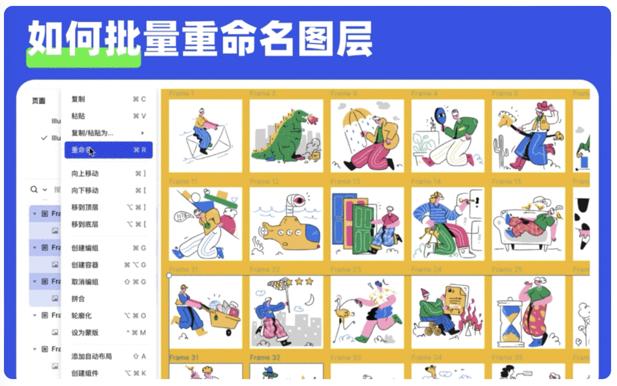 在 MasterGo 中目前有以下两种方式可以调整图层命名:一种是「双击重命名」,在左侧图层树通过双击图层名称即可对图层进行重命名。另一种是「批量重命名」,在左侧图层树中框选多个图层后右键唤起右键菜单栏,点击重命名,或者使用快捷键 Command + R ,即可批量重命名。