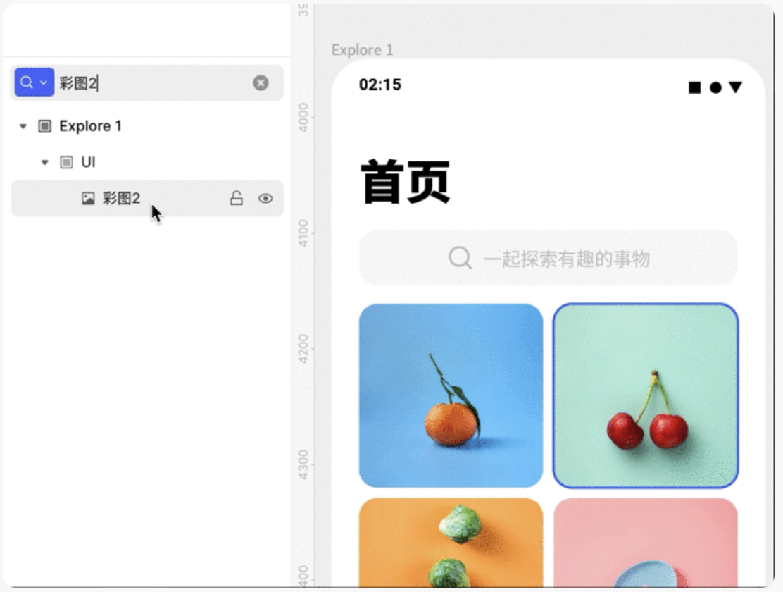例如,当你想要找命名为“彩图 2”的图片图层时,我们可以选择左侧图层栏筛选框的「图片」选项,图层树将只展示所有的「图片」属性的图层(也包括其所有父级容器),然后,你可以在搜索框内输入图层名称「彩图2」,即可快速找到你要的图层啦。