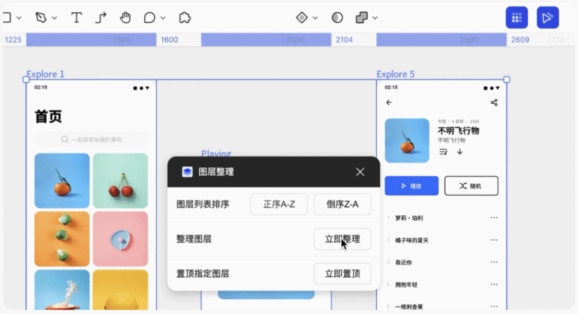MasterGo 图层整理插件,支持一键整理画布内的元素,图层列表的正序&倒序、置顶图层,还可以自动调整画布内的画板布局,让你的文件井井有条、不再凌乱,帮助大家在交付时更有效率地管理和使用文件。