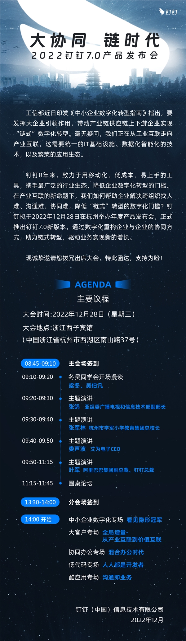 钉钉将于12月28日在杭州举办2022钉钉7.0产品发布会。此次发布会以“大协同 链时代”为主题,钉钉将正式发布7.0版本,通过数字化重构企业与企业之间的协同方式,助力产业链上下游实现链式转型。