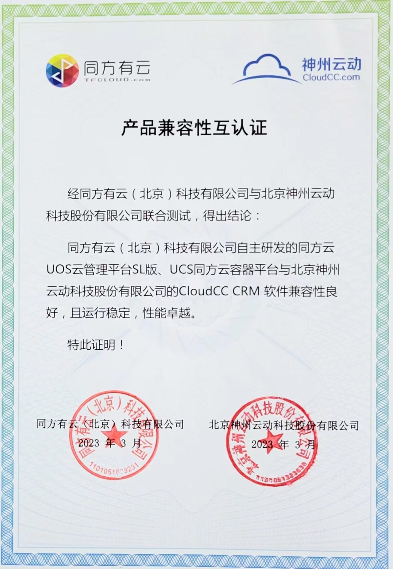 神州云动CRM与同方云平台完成兼容性互认证