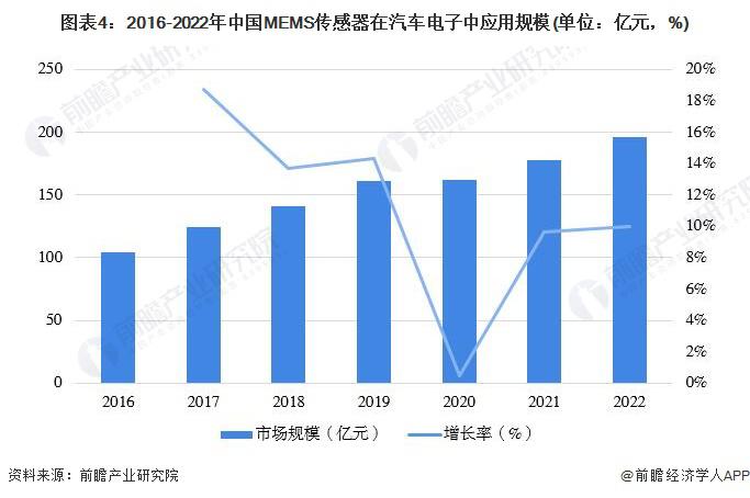 经过多年发展,中国汽车市场已成为全球增速最快的汽车市场之一。随着中国汽车销量的增加,MEMS 传感器应用也随之快速增长。数据显示,2020 年我国 MEMS 传感器在汽车电子中的应用规模为 162.2 亿元,并且 MEMS 技术汽车传感器逐步取代传统的传感器,成为汽车传感器的主流。初步核算,2022 年 MEMS 传感器在汽车电子的应用规模接近 200 亿元。