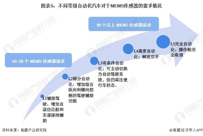 随着全球汽车从 L0 时代逐渐向 L1-L5 时代迈进,智能系统对于 MEMS 传感器的需求随之增长,自动化水平越高,所需装载的传感器个数越多。全球平均每辆汽车包含 10 个传感器,在智能汽车中,大约采用 25 至 40 只 MEMS 传感器。