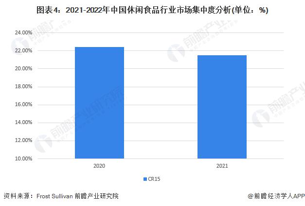 Frost & Sullivan 数据显示,2020 年我国休闲食品市场前 15 名市场份额为 22.4%,2021 年,前 15 名市场份额进一步降低,为 21.5%,整体来看,市场竞争格局分散,集中度相对偏低。