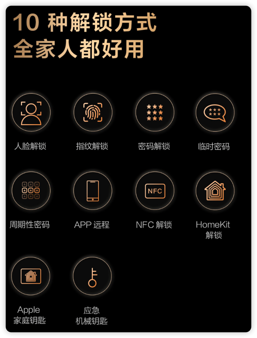 Aqara 智能门 V100 支持人脸解锁、指纹解锁、密码解锁、临时密码解锁、周期性密码解锁、APP 远程解锁、NFC 解锁、HomeKit 解锁、Apple 家庭钥匙解锁、应急机械钥匙解锁。