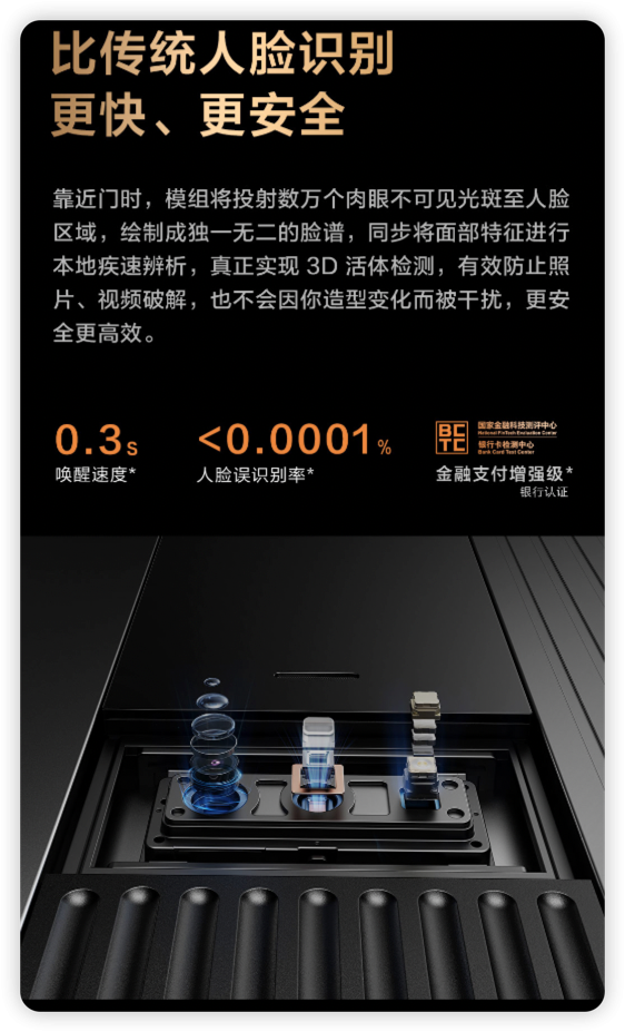 Aqara 智能门 V100 采用3D 结构光人脸识别,靠近门时,模组将投射数万个肉眼不可见光斑至人脸区域,绘制成独一无二的脸谱,同步将面部特征进行本地疾速辨析,实现3D活体检测,更安全、高效。