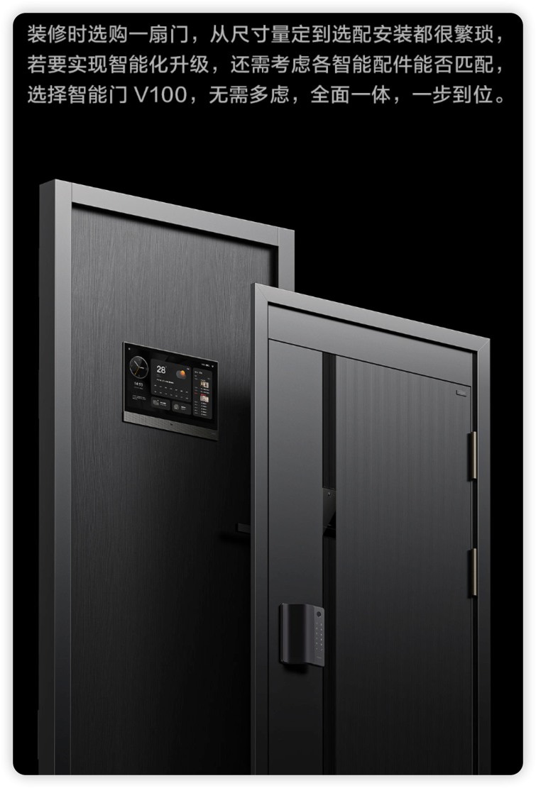 6月15日,智能家居独角兽企业 Aqara 推出了旗下首款智能门——Aqara 智能门 V100。Aqara 智能门 V100集智能猫眼、智能门锁、妙控屏一体设计,你家的入户门一站式解决方案,支持全尺寸定制,多色搭配。