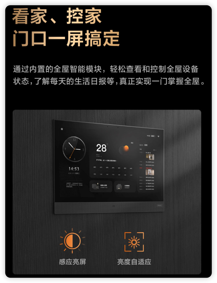 Aqara 智能门 V100配备一块 15.6 英寸的全屋妙控屏,可以轻松查看和控制全屋设备状态,了解每天的生活日报等,实现一门掌控全屋。