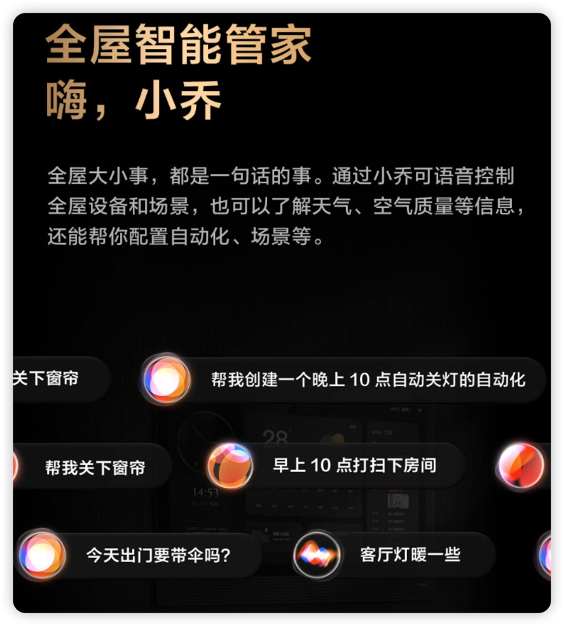 通过小乔可语音控制全屋设备和场景,也可以了解天气、空气质量等信息,还能自动帮你配置自动化、场景等。