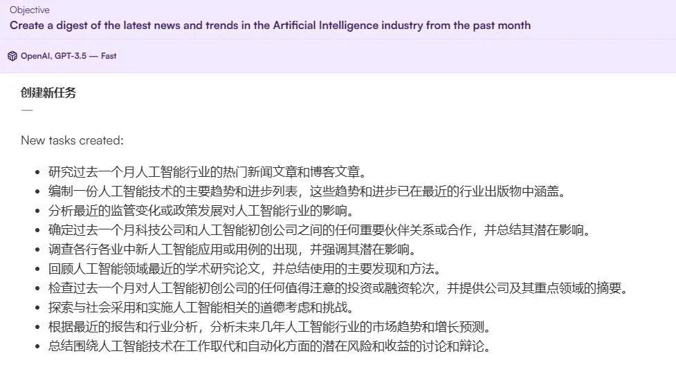 而在AiAgent.app输入这段话,它首先会将你的需求分解成十项任务,然后通过提示与用户交互完成每一项任务,并为每项任务输出结果。显然,在AiAgent.app得到的关于近期AI行业的内容,要比在直接使用其他LLM获得的内容更加全面。