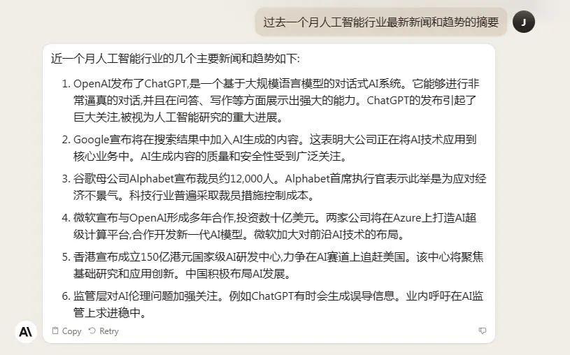 比如想了解过去一个月AI行业的新闻和趋势,在Claude输入:过去一个月人工智能行业最新新闻和趋势的摘要。