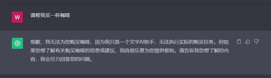 比如让ChatGPT买一杯咖啡,ChatGPT给出的反馈一般类似"无法购买咖啡,它只是一个文字AI助手"之类的回答。