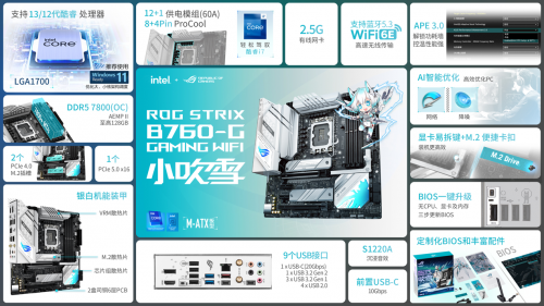 华硕B760小吹雪主板采用12+1供电模组(60A),搭配8+4 Pin ProCool高强度供电接口,轻松驾驭14、13、12代酷睿三代处理器。特加入了APE 3.0(ASUS Performance Enhancement 3.0)功能,在BIOS中开启后即可一键解锁处理器功耗,提供更强的处理器性能释放。华硕还贴心地加入了温度墙为90℃的解锁模式,玩家可根据自己PC情况酌情选择。支持DDR5高频内存和AEMP 2.0,内存频率至高支持DDR5 7800+(超频)。拥有2个PCIe 4.0 M.2接口,均覆盖高效散热片,可显著降低SSD温度,疾速传输不掉速。板载PCIe 5.0 x16高强度显卡插槽,更是在MATX板型上巧妙加入显卡易拆键,拆卸显卡一键搞定。预装了一体化I/O背板,美观易安装。丰富的USB接口,满足玩家同时外接多个设备的需求。包括传输速度高达20Gbps的USB 3.2 Gen 2x2 Type-C接口,以及前置USB 3.2 Gen 2 Type-C接口等。配备2.5G有线网卡和WiFi 6E无线网卡,带来疾速低延迟的网络游戏环境,支持蓝牙5.3,可提供低延迟无线设备连接体验。支持双向AI降噪功能,再加上Sonic Studio III智能音效管理软件和DTS音频环绕等,提供“声”临其境般音效体验。更有M.2便捷卡扣、Q-LED故障诊断灯和BIOS FlashBack一键升级,进一步优化玩家装机体验。支持AURA SYNC神光同步,并板载3个第二代可编程ARGB灯效接针,可与不断推陈出新的兼容华硕AURA SYNC的硬件设备灯效同步,轻松打造炫酷的游戏氛围!
