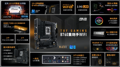 华硕B760重炮手WIFI主板采用12+1供电模组及用料扎实的DrMOS,搭配8+4Pin ProCool高强度供电接口,为处理器提供强劲电力支持。同样加入了APE 3.0功能,一键解锁功耗墙,为玩家提供更强的处理器性能释放。同样支持DDR5内存和AEMP 2.0,内存频率至高支持DDR5 7200+(超频)。板载疾速双PCIe 4.0 M.2接口,均覆盖M.2散热片,强效降温,令SSD疾速传输不掉速。同样拥有M.2便捷卡扣设计,装卸SSD设备更简单。前瞻性的支持PCIe 5.0规格显卡,还有预装一体化I/O背板,防尘防静电,简单易安装。拥有丰富的USB接口,包括后置的USB 3.2 Gen 2x2 Type-C接口,传输速度高达20Gbps,方便外接多个设备,扩展性强。板载2.5G有线网卡和WiFi 6无线网卡,为用户带来疾速畅快的网速体验。主板配备双向AI降噪技术和DTS音效定制,带来绝佳游戏体验。支持AURA SYNC神光同步,板载3个第二代可编程ARGB灯效接针,可与相关兼容设备实现灯效联动,打造一体化整机光效。