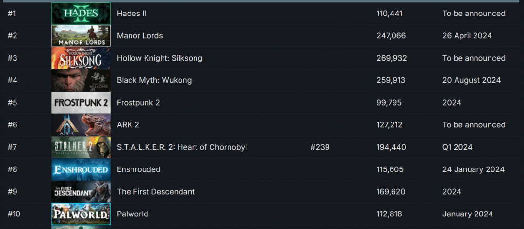 首先是在预热阶段,除了预告片等常规物料外,《幻兽帕鲁》在正式上线前几天,已经开始有部分主播在做一些预热直播,再加上相关的切片短视频传播,《幻兽帕鲁》的前期热度就已不低。SteamDB数据显示,《幻兽帕鲁》正式发售前一周,便在Steam愿望单上挤进前十位。