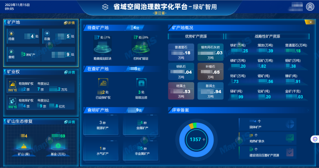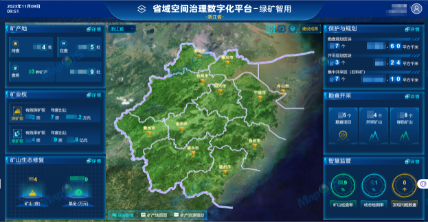 由中地数码承建的浙江省“绿矿智用”省级综合场景,集成了金华市、台州市、杭州市、湖州市等地不同专题试点子场景,以矿产地为基本单元串联矿产资源保护与规划、矿业权管理、勘查开采、生态修复和智慧监管各阶段信息,实现矿产资源全周期、全业务、全流程管理。