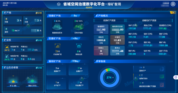 以矿产资源“找得出、用得好、管得住”为目标,打通相关业务流程,通过跨部门、跨层级数据协同共享,建立省市县三级联动的数据集成融合体系,构建全省“绿矿智用”数字驾驶舱,关联智慧地矿一张图,对矿产地、矿业权、保护与规划、勘查开采、智慧监管各环节全周期的核心指标进行图数一体化展示与动态检测、分析、预警,为各级领导管理决策提供参考。