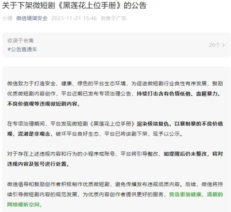 之后,抖音、快手、微信等平台也立马发布各自打击违规微短剧的公告,据互联网消息,公告发布后一段时期各类平台共下架短剧 3.17 万部。其中,咪蒙厂牌 " 听花岛 " 的《黑莲花上位手册》依靠复仇、爽剧、大女主题材,在上线 24 小时内吸引了近 2000 万元的充值,但短短两天就被全网下架引发了大量讨论。
