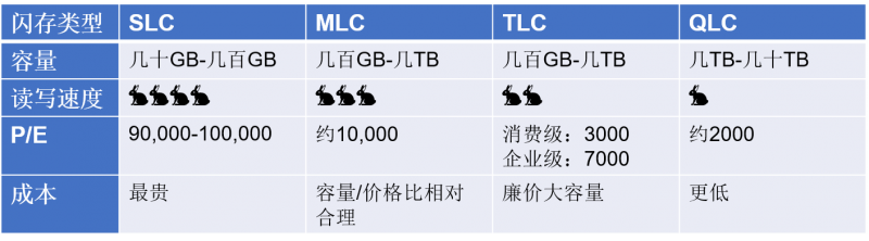 基于各类型存储单元的闪存颗粒,在性能、使用寿命和成本等方面的对比如下表所示。