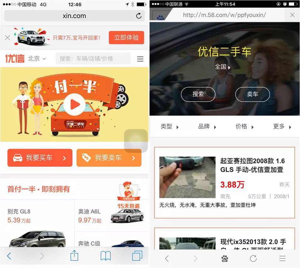 其实关于58与优信间的深度合作,坊间信以为真,并非空穴来风。首先,从手机端百度搜索引擎检索“优信二手车”关键词,搜索结果中看似是优信二手车的链接, 点击进入之后,却变成了58同城的域名。这一举措是在是让人匪夷所思,当然,也是网络流传58将收购优信或者合并优信猜测的根源。