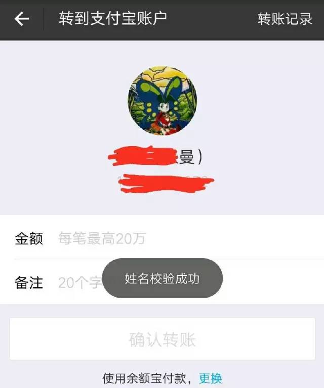 输入姓氏之后,确认,姓名校验成功,你就可以放心转账了!