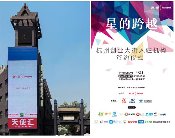 2016年4月21日,北京中关村创业大街由跨星主办,杭州银行(滨江支行)、聚光科技、天使汇协办的杭州创业大街签约仪式圆满完成,杭州创业圈将迎来史上规模最大的一次品牌入驻,其中包含了天使汇,创业邦,3W,华为华友会,腾讯南极圈,亚杰商会,以太,脉脉,微链,亿欧,天 天投,曲速空间,志趣社,跨星空间,联合农创,睿洋联创,面包公装,浙江省创新创业协会,此次跨星与各机构的战略合作意义重大,是继中关村创业大街、深圳湾创业广场后,全国第三大创业街区和华东地区第一大创业集聚街区——杭州创业大街正式宣布盛大开启。