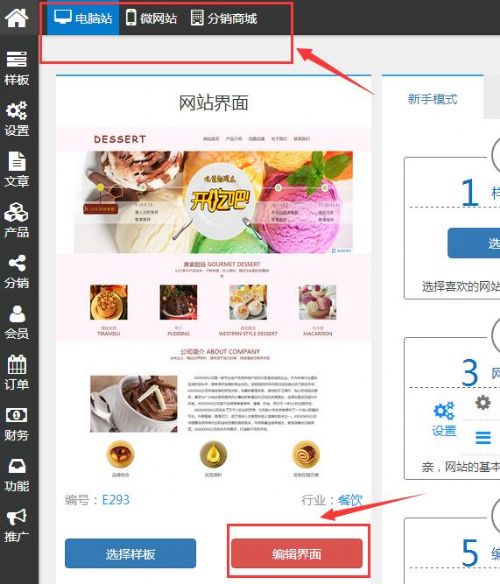 第四、样板安装完成之后,选择“电脑网站”或“微官网”抑或“分销商城”,点击“编辑界面”,进行编辑。
