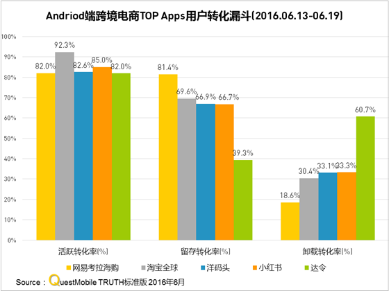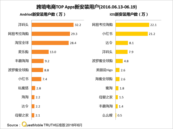 QuestMobile数据显示,整个6.18那一周,主流跨境电商新安装用户表现上,安卓端洋码头、网易考拉海购、淘宝全球位居前三,均在30万左右;iOS端,网易考拉海购、小红书、达令、洋码头位居前四,前两者在20万以上,后两者在8万左右。