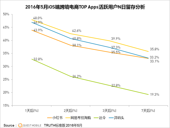 最后,再来看看2016年5月份几家主流跨境电商APP活跃用户N日留存表现。QuestMobile数据显示,无论iOS端还是安卓端,网易考拉海购的留存表现都是最佳的,其次是洋码头、小红书。