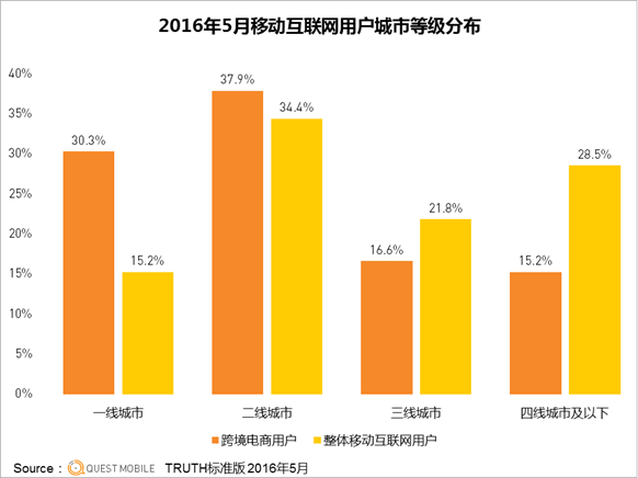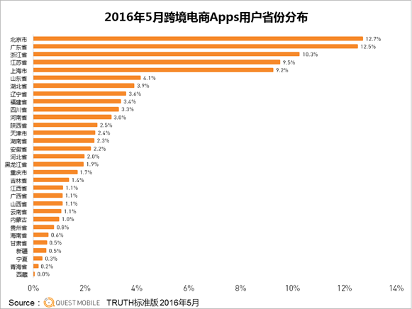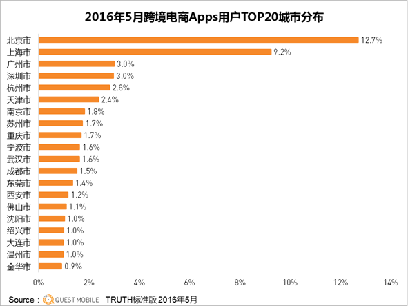再来看看城市分布,相比整体移动互联网用户,跨境电商用户的比例构成上,一线城市高出了一倍,二线城市也高出不少,三四线城市则低了不少,而在具体地域分布上,北京、广东、浙江、江苏、上海遥遥领先,具体的城市上,北京、上海、广州、深圳同样遥遥领先,联系到前面人群年龄结构的构成上,可以看出,跨境电商还有不小的增长空间,前提是,二三四线城市能有足够的购买力。