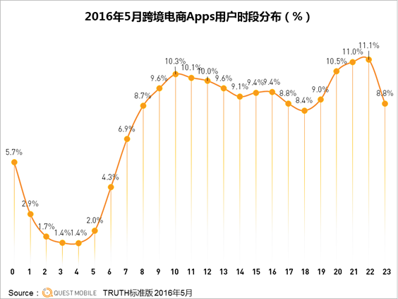 从跨境电商APP用户时段分布上看,大家在上午上班时间、晚上睡觉前比较活跃,完全契合上班族的生活习惯,哈哈。