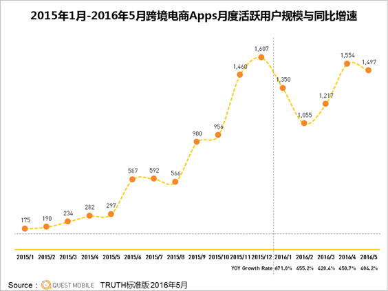 QuestMobile数据显示,总体上看,去年下半年,跨境电商MAU用户数量出现了快速的爬坡,5月用户规模同比快速飙升404%。这一过程与国内消费升级过程同步,也正是在去年下半年,出现了众多媒体报道,国人涌入日本抢购马桶盖、电饭煲,(⊙o⊙)…Mr.QM向毛主席保证,不是有意把这两个连在一起的……