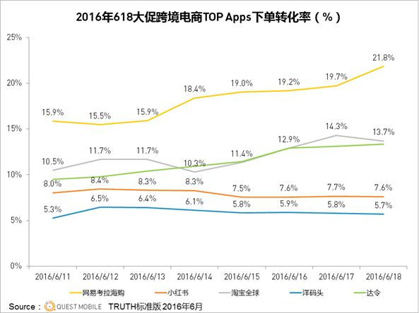 QuestMobile数据显示,整个6.18期间,网易考拉海购的下单转化率最高,而且持续增长,其次是淘宝全球和达令。小红书主打海淘购物分享社区,所以在用户规模上比较突出,但是下单转化率偏低,所以这种局面也可以理解。