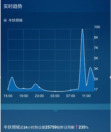 #半妖倾城 #位居电视剧最热话题榜榜单第一位,微博话题#半妖倾城#等关键词的阅读数已接近6亿。半妖倾城近24小时热议度直线飙升,较昨日同期上涨235%。百度指数近7天数据显示,#半妖倾城#搜索指数整体环比上涨465%,移动环比上涨393%;惊喜飙升的数据实力证实网友的高关注度。