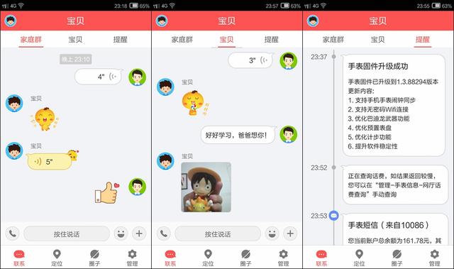 360儿童卫士APP的界面也是非常简洁,分别设有联系、定位、前置和管理四大版块。在联系界面里,家长就可以在家族群里发言了,也可以和宝贝单独聊天,文字、语音、图标、表情统统支持,同时还可以及时了解到手表的一些相关动态。