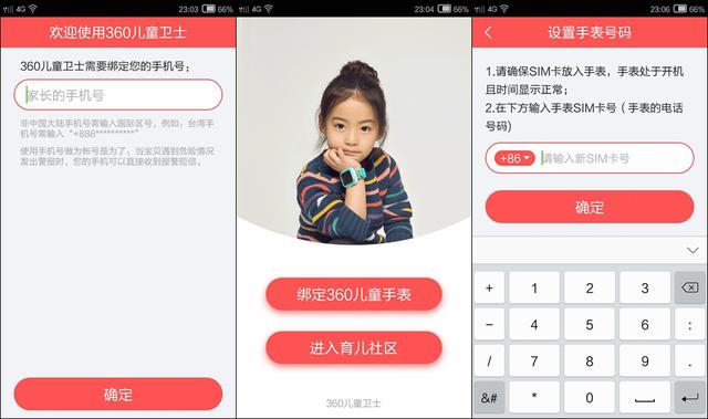 第一次运行360儿童卫士APP,在输入家长的手机号之后,就需要先与巴迪龙5s绑定,步骤很简单,根据手表上的引导扫描手表上的二维码即可,然后再输入手表SIM卡的手机号就可以了。